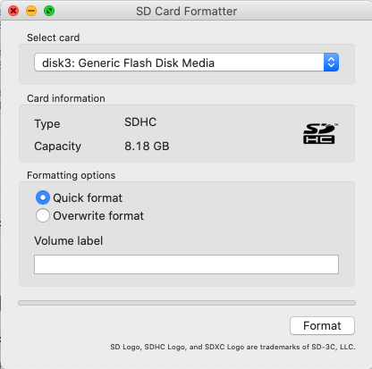 SD Card Formatter 첫 번째로USB 포맷은 SD Card Formatter(https://www.sdcard.org/downloads/formatter/eula_mac/index.html)를 사용했습니다.