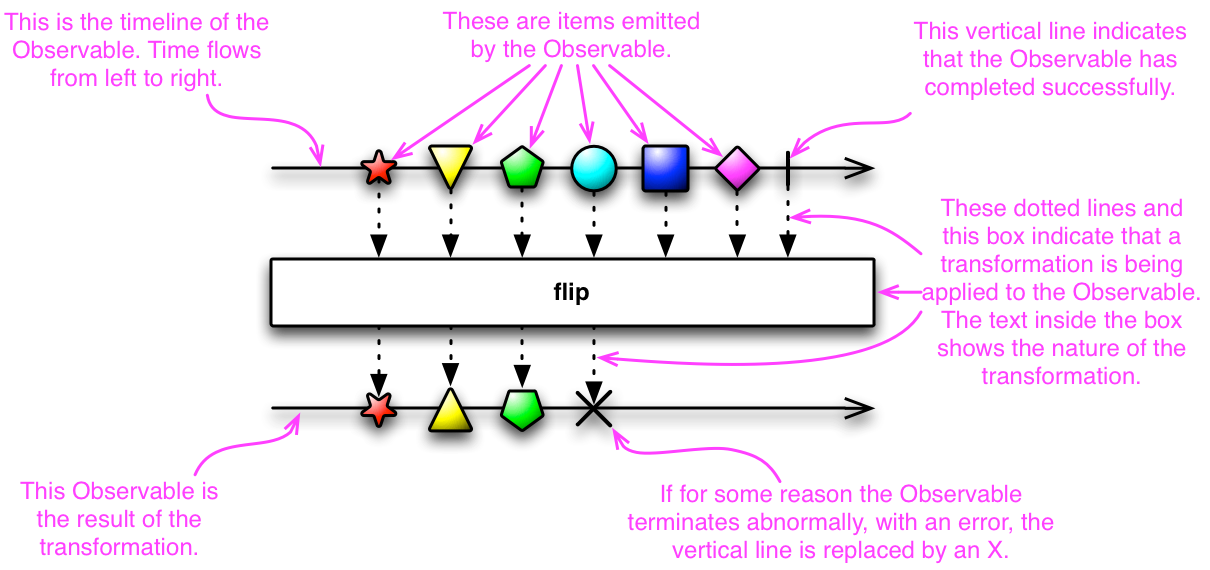 - onError: 예상한 데이터를 생성 못했거나 오류가 발생했을 때 call 됩니다. onError는 onNext 또는 onCompleted를 더 이상 호출하지 않습니다.