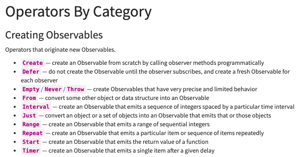 Rx 연산자들 (출처: ReactiveX) rx의 연산자들은 위 이미지처럼 나와있습니다. 일단 처음으로 Create를 이용해서 observable을 만들어 보겠습니다.