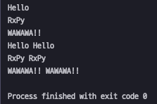 1234567891011121314151617from rx import createdef hello_rx(observer, scheduler):observer.on_next("Hello")observer.on_next("RxPy")observer.on_next("WAWAWA!!")observer.on_completed()def str_double(_str: str):print("{} {}".format(_str, _str))source = create(hello_rx)source.subscribe(lambda x: print(x))source.subscribe(str_double)자 이제 구독을 해보겠습니다. 일단 저는 두 가지 구독자(?)를 만들어서 구독을 했습니다. lamda로 만든 리턴 값을 출력해주는 함수와 str_double(작명 센스 ㅆㅎㅌㅊ)라는 리턴되는 string을 두 번 출력하는 함수 이 두 가지입니다.