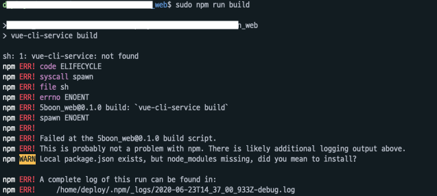 dependancy 라이브러리 설치가 안되서 build 실패 나는 경우 (주의: 패키지에 라이브러리들이 별로 없으면 에러가 안 날 텐데 vuetify 같은거 사용할 경우 dependancy 에러가 날 수 있습니다. 이때는 npm install을 해주시면 됩니다.)