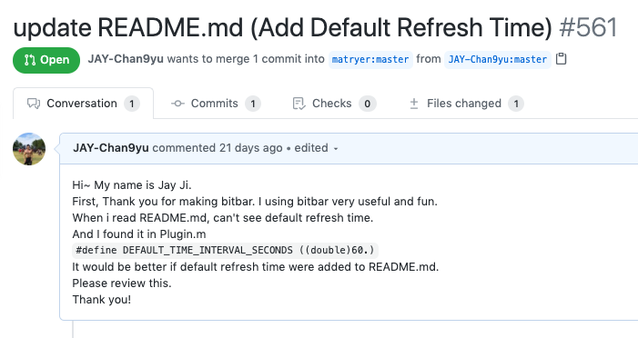 BitBar에 PR를 했습니다!!! 그래서 저는 제가 사용하고 있는 오픈소스 플러그인에 README 수정부터 시작했어요!