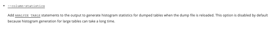 MySQL 8.0 레퍼런스 문서 Performance Options MySQL 공식 문서를 찾아보니, 8.0부터 새로 추가된 옵션 때문에 나는 에러이더라고요. 해당 옵션이 활성화되어있으면 덤프 할 때 ANALYZE TABLE에 히스토리를 생성(?) 하는 것 같아요.