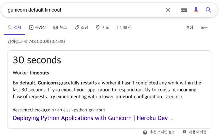 구글링 결과 이경우 Gunicorn TimeOut 보다 커넥션 시간이 길어져서 끊긴 경우라고 한다. 현재 진행하고 있는 토이프로젝트 서비스 특성상 꽤 많은 응답시간이 걸리는 경우가 있기 때문에 TimeOut 을 늘려줘야 했다.