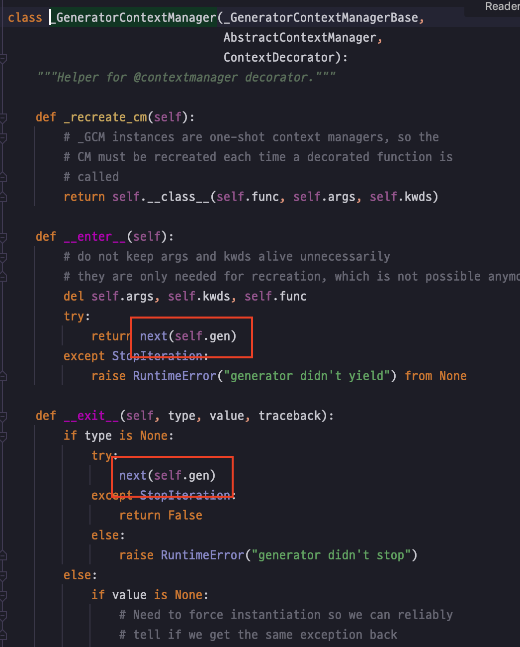 __enter__(), __exit__() 보면 next() 함수로 self.gen을 실행하고 있고, self.gen은 전달된 function입니다. 여기서 next()가 generator이기 때문에 yeild를 사용하는 것입니다.