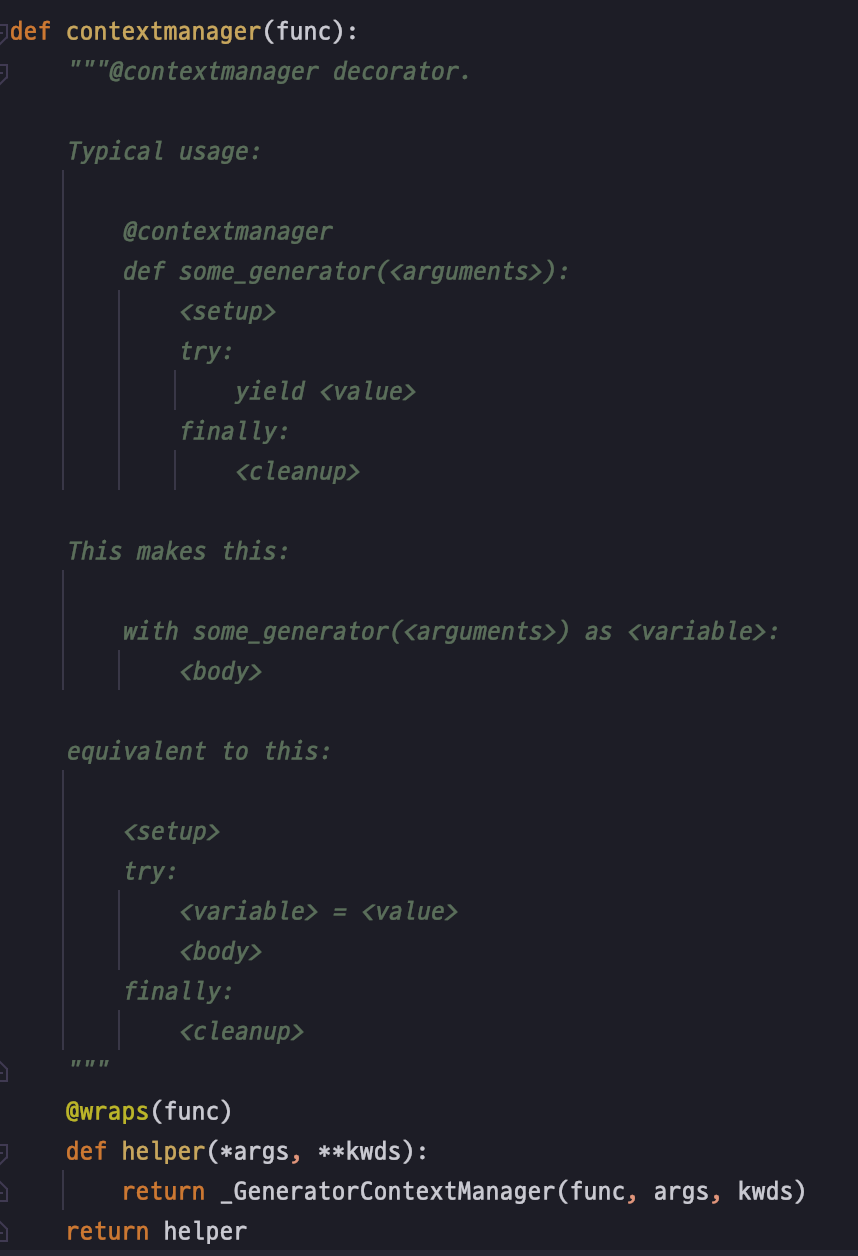 두 번째 방법은 contextlib.contextmanger 데코레이터를 사용하는 방법입니다. python에서는 편리하게 미리 라이브러리에 정의되어 있네요. 다만 contextlib.contextmanger를 사용하기 위해서는 내부에 yeild를 사용하여 generator iterator 객체를 반환해야 합니다. 쉽게 말해 제너레이터(generator) 형태로 함수를 만들면 된다는 겁니다. (그 이유는 좀 더 뒤에 설명)
