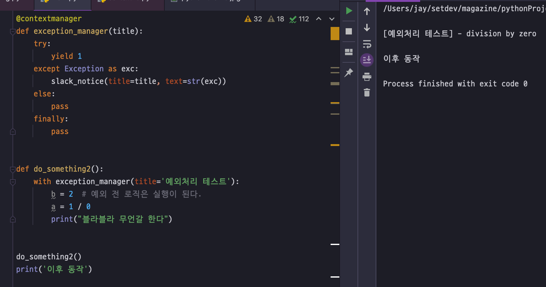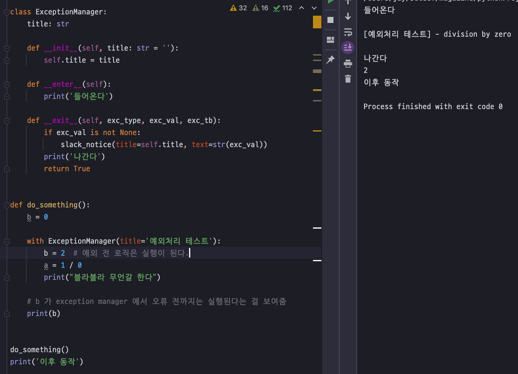 context manager를 사용해서 예외처리한 예 보시면 division by zero 오류가 난 이후에도 다음 동작이 잘 실행된 걸 확인할 수 있습니다. __exit__() 함수가 True를 return 하면 오류 없이 실행이 됩니다.