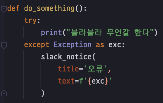 제가 최근에 context manager를 회사 로직에서 유용하게 사용할 수 있었던 건 예외처리에 대한 부분입니다. 보통 핸들링하고 싶은 오류 등이 있을 때 try-except 구문을 사용해서 slack 알림을 보내는 로직을 썼습니다.