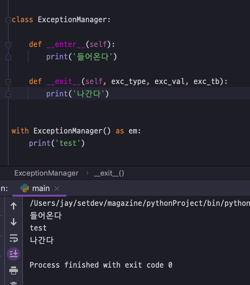 123456789101112class ExceptionManager:def __enter__(self):passdef __exit__(self, exc_type, exc_val, exc_tb):passwith ExceptionManager() as em:print('test')cs context manager는 __enter__(), __exit__() 두 개의 매직 메서드를 기본적으로 가지고 있어야 합니다. 함수명 그대로 들어오고 나가는 부분을 정의하는 함수들입니다.