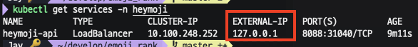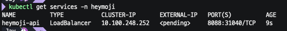 get service 실행결과 heymoji라는 네임스페이스에 떠있는 heymoji-api 정보를 확인할 수 있습니다. 일단 포트(Port)를 보면 8088로 설정된 걸 볼 수 있는데 EXTERNAL-IP 가 pending 되어있는 걸 볼 수 있습니다. 딱 봐도 뭐가 이 EXTERNAL-IP가 외부로 연결되는 IP 같죠??!