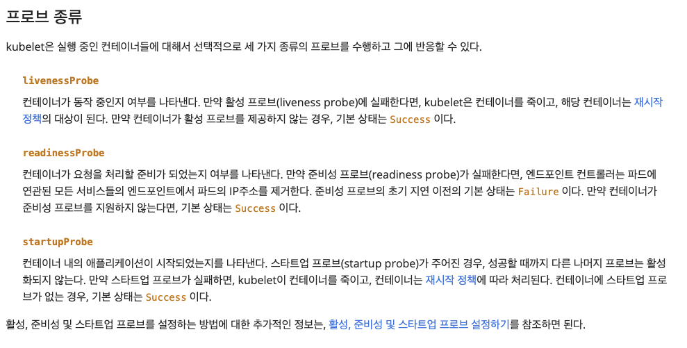 프로브 종류 (출처: https://kubernetes.io/ko/docs/concepts/workloads/pods/pod-lifecycle/)