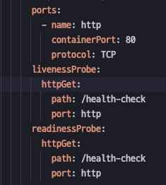 helath check api 간단하게 헬스체크 api를 만들어주고 deployment.yaml 에 가서 health check 경로를 지정해줍니다. health check의 경우 프로브(probe)라는 것을 통해 설정 할 수 있습니다.